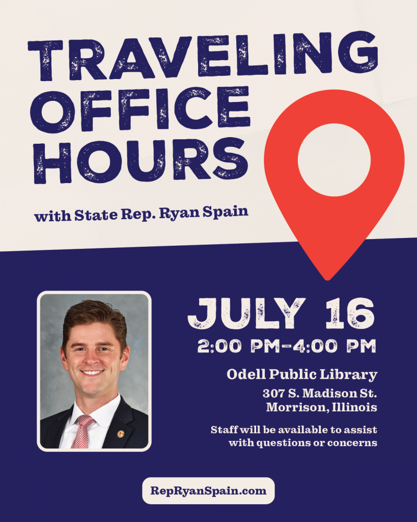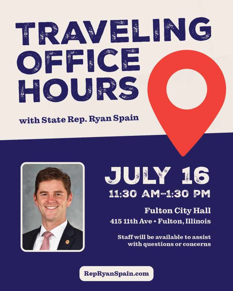 To assist 73rd House District residents, State Representative Ryan Spain (R-73rd District) invites constituents to attend one of his upcoming Traveling Office Hours on July 16 in Fulton and Morrison. Rep. Spain or a member of his staff will be available to meet with constituents to discuss any questions or concerns on state issues impacting our communities.