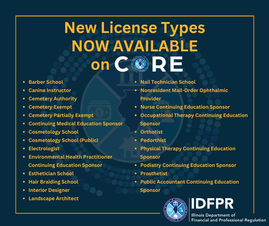 24 more professions are now available for licensure via IDFPR’s new online licensing system, CORE.