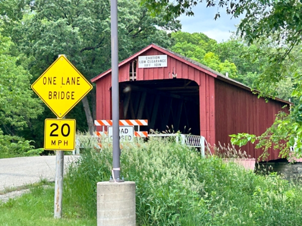 Like many other covered bridges owned by the state, the Red Covered Bridge is listed on the National Register of Historic Places and protected under Section 106 of the National Historic Preservation Act of 1966., But it also has the distinction as the only state-owned covered bridge still open to traffic, accommodating an average of 275 vehicles a day.